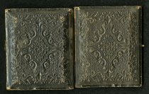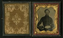 Ninth-plate ambrotype with applied color; man seated, legs crossed left over right at knee, knees up; wearing single-breasted uniform jacketwith high standing collar, eight visible buttons, all buttoned close, pointed cuff piped in lighter color, gloves, holding a forage cap with waterproof cover; curly hair, parted on the side, clean shaven, cheeks tinted pink, right arm bent at elbow, gloved hand resting in lap, left arm bent and elbow resting on draped table; nonpareil gilt mat, stamped with foliate motif; preserver has foliate motif stamped into it; case is leather-covered wood, with foliate medallion and scroll embossed into exterior obverse and reverse case covers; obverse interior case cover has faded velvet lining with embossed pasley scroll; obverse and reverse case cover pieces are detached; |